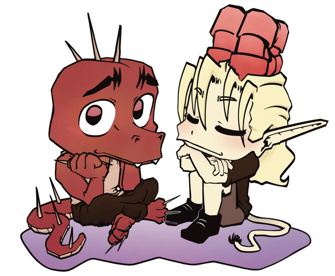 under my webtoon, SayFallenSFNInitiative follows a slice-of-life queer relationship in a chibi Dungeons & Dragons world! Yaevar and Ruyn bring down an underground market that sells their respective race's scales/horns.Contains cute moments and well-paced communication!